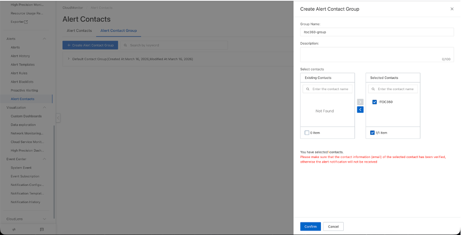 Alert rules in CloudMonitor do not reference contacts directly — they reference groups. You need to wrap the contact you just created inside a group before it can receive notifications.