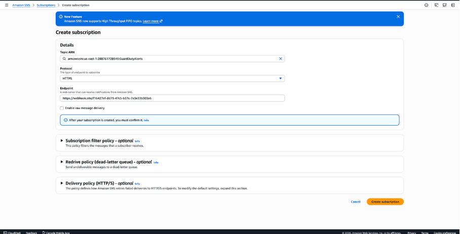 | No alerts arriving after rule creation    | EventBridge rule not matching, or SNS subscription not confirmed | Check CloudWatch metrics for the EventBridge rule; verify subscription status |