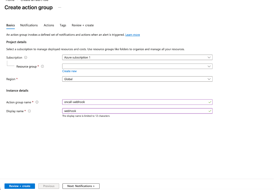 * **Action group name** — something descriptive like `oncall-webhook`