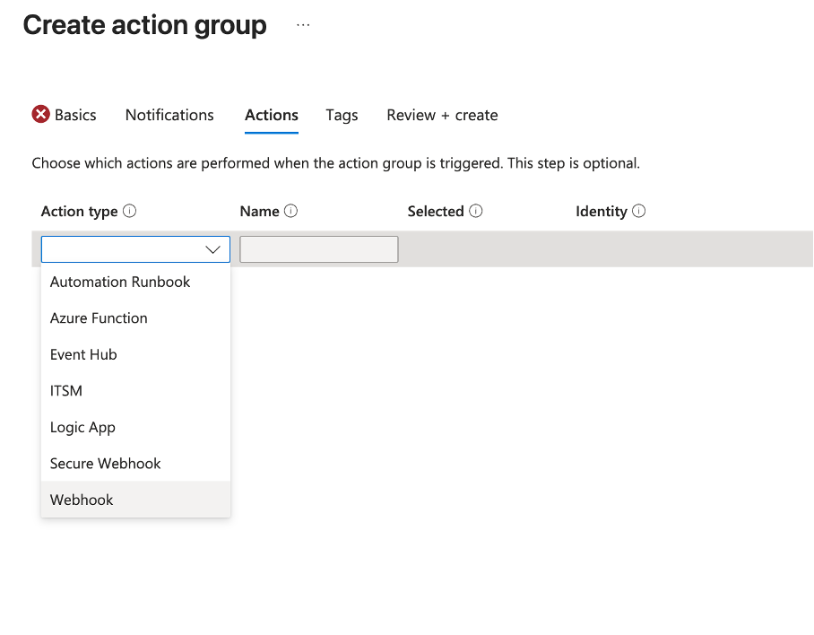 Move to the **Actions** tab. Click the **Action type** dropdown and select **Webhook**.