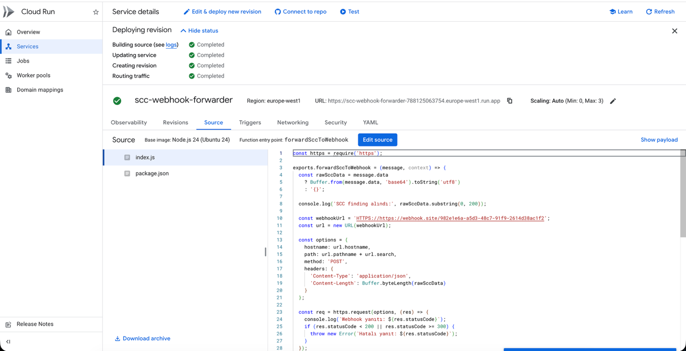 — Cloud Function deployed successfully with green tick, entry point forwardSccToWebhook visible&#x20;