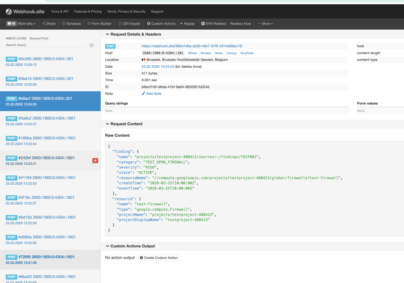 * The payload contains the correct `finding.category`, `finding.severity`, and `resource.projectDisplayName`.