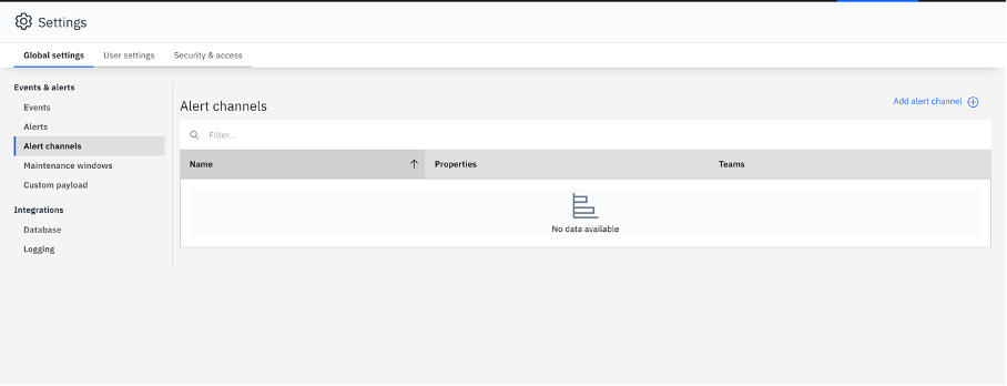 Navigate to **Settings** from the left sidebar, then open **Global settings** and go to **Events & alerts → Alert channels**. Click **Add alert channel** in the top right corner.