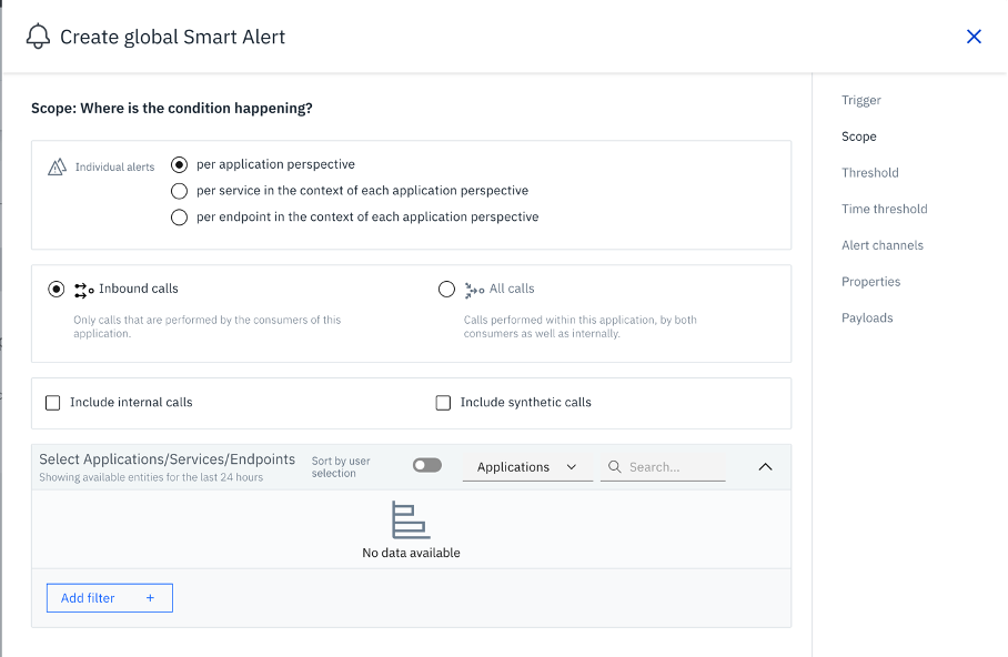 On the scope step, leave the defaults as they are — alerts will be scoped per application perspective across inbound calls.