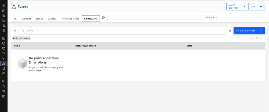 With the alert channel in place, head to **Events** in the left sidebar and switch to the **Smart Alerts** tab. Click **Create Smart Alert**.