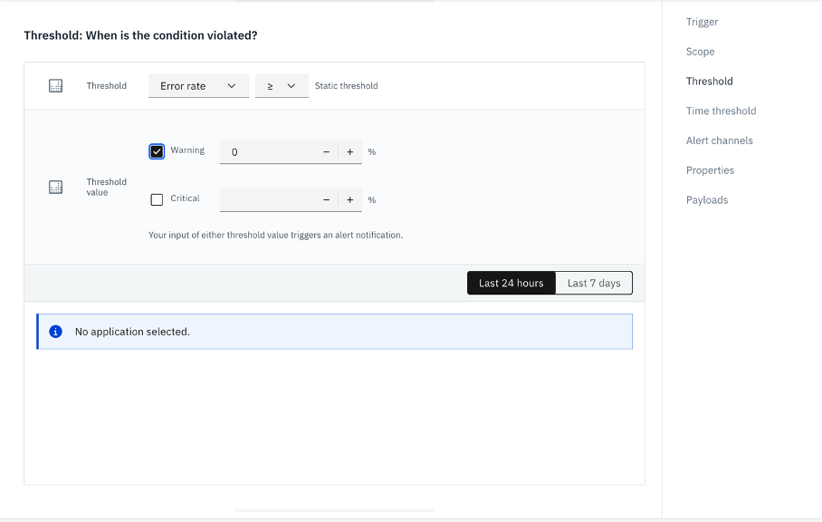 On the threshold step, check **Warning** and set the value to your desired error rate percentage. Any value above zero will cause Instana to fire as soon as errors appear, which is useful for testing the integration.