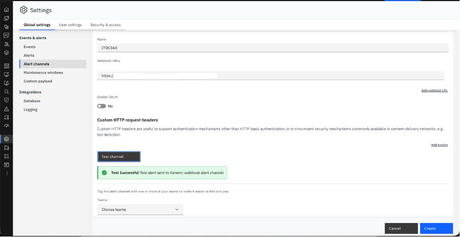 Give the channel a name, paste your ITOC360 webhook URL into the **Webhook URLs** field, and click **Test channel** to verify the connection. You should see a confirmation that the test alert was delivered successfully.