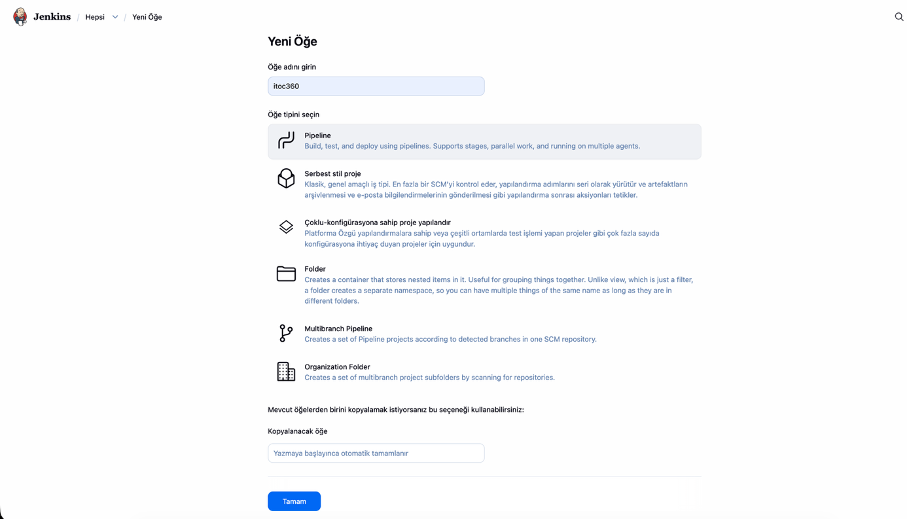 Start by navigating to the Jenkins dashboard and clicking **New Item** in the left sidebar. Enter a name for your job — something like `itoc360` works fine — and select **Pipeline** as the item type.