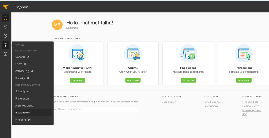 Open your Pingdom dashboard and navigate to **Settings → Integrations** from the left sidebar.