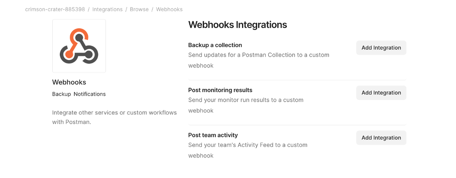 Go to **Integrations**, click **Add Integration**, and select **Postman Monitors** from the list. Copy the webhook URL that appears — you'll need it in the next steps.