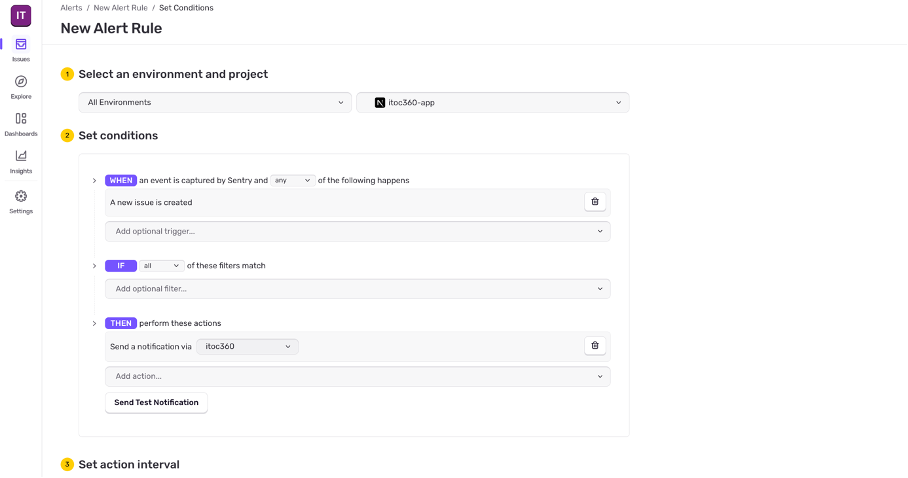 Sentry is an error tracking and performance monitoring platform that helps development teams catch and fix issues in real time. With this integration, you can forward Sentry issue events directly into ITOC360 as alerts — so when something breaks in production, your on-call team gets notified immediately through the usual escalation flow.