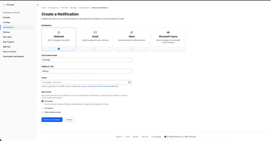 Terraform Cloud is HashiCorp's managed infrastructure automation platform that lets teams collaborate on Terraform runs, manage state remotely, and enforce policies across their infrastructure. It supports workspace-level webhook notifications that fire on run events — making it easy to route pipeline failures, plan results, and apply outcomes directly into ITOC360.