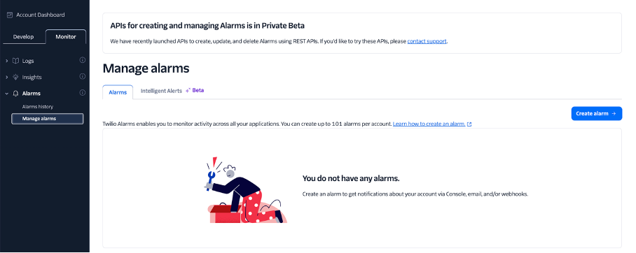 In the Twilio Console, click the **Monitor** tab at the top of the left sidebar. Under **Alarms**, click **Manage alarms**.